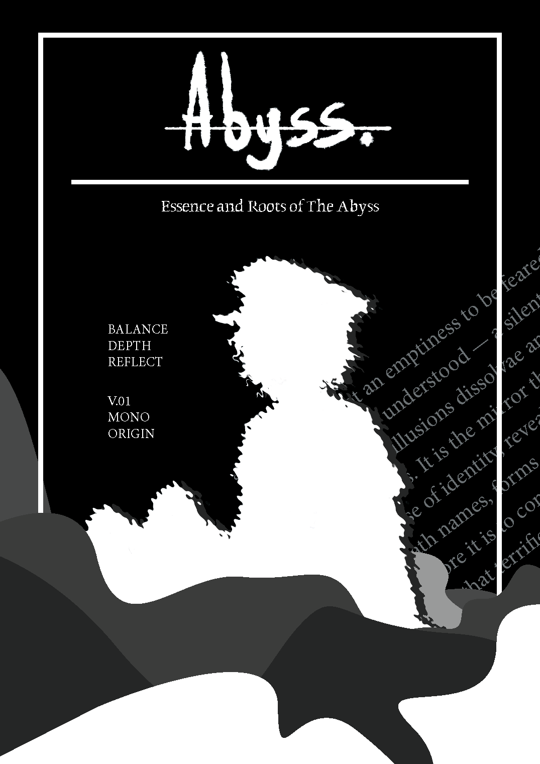 Abyss is a conceptual brand identity project that explores the deeper and often unspoken layers of human emotion through minimalism, contrast, and atmospheric design. Using a symbolic color palette of Soul White, Serenity, Abyss Black, and Fragile, the project visualizes the tension between softness and depth, clarity and darkness, vulnerability and weight. The identity was developed through a structured creative process involving moodboard creation, logo experimentation with fonts, hand-drawn variations and geometric elements, and the application of the visual language across a magazine and poster. With its use of liquid shapes, restrained layouts, and avant-garde typography, Abyss functions both as an emotional exploration and a reflection of the designer’s personal style. The project ultimately demonstrates how abstract feelings can be translated into coherent visual communication while also serving as a meta-representation of the designer’s creative philosophy and artistic identity